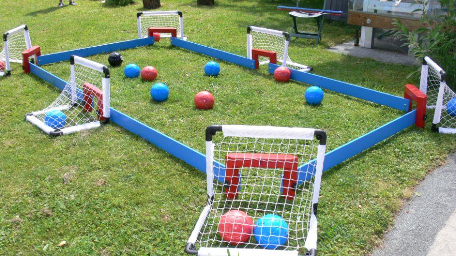 Neuartig und spannend: auf dem kleinen Feld (2 x 4 Meter) befinden sich 15 Fussbälle die nach den Regeln des Billards in die Tore gekickt werden müssen.